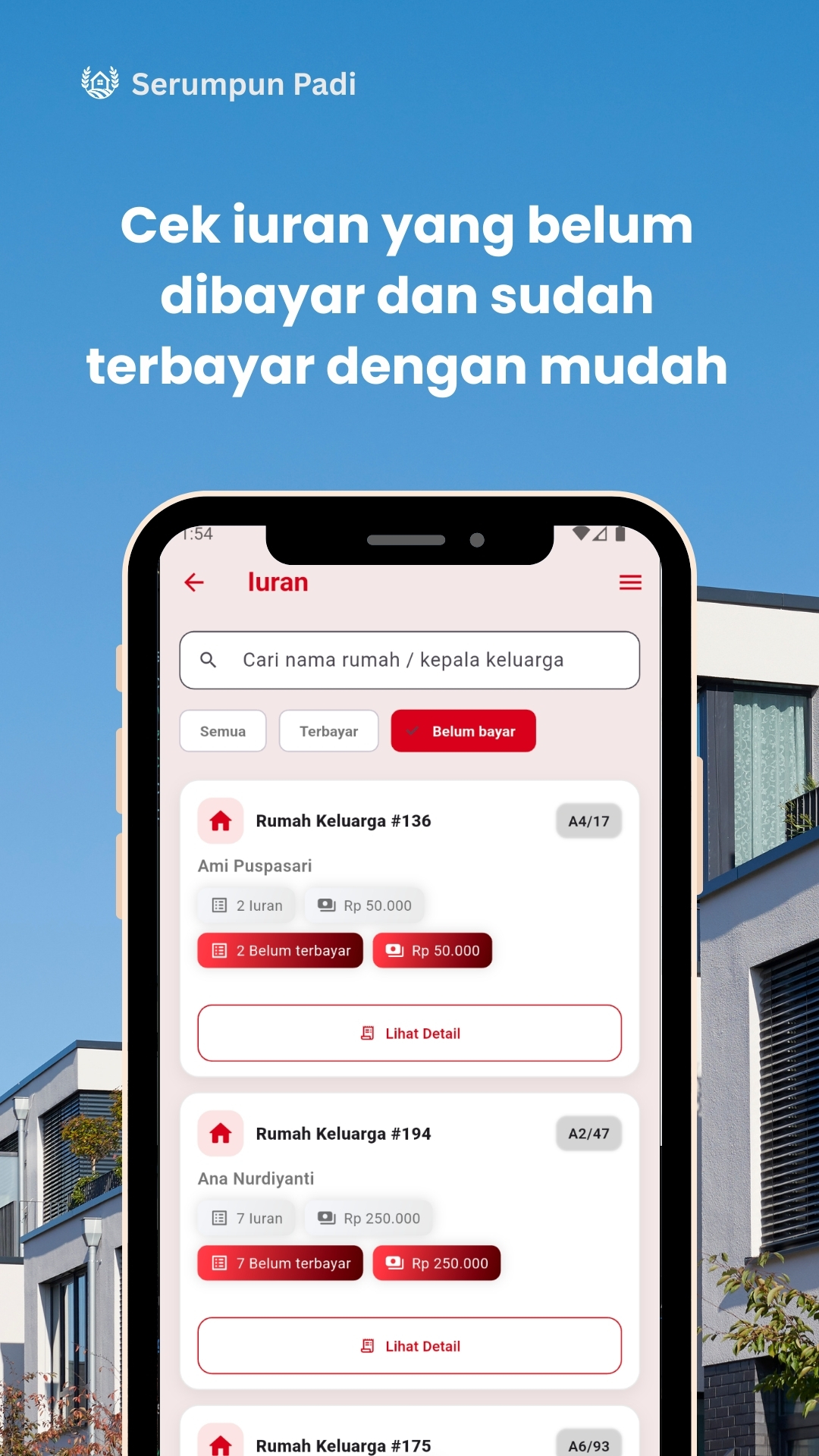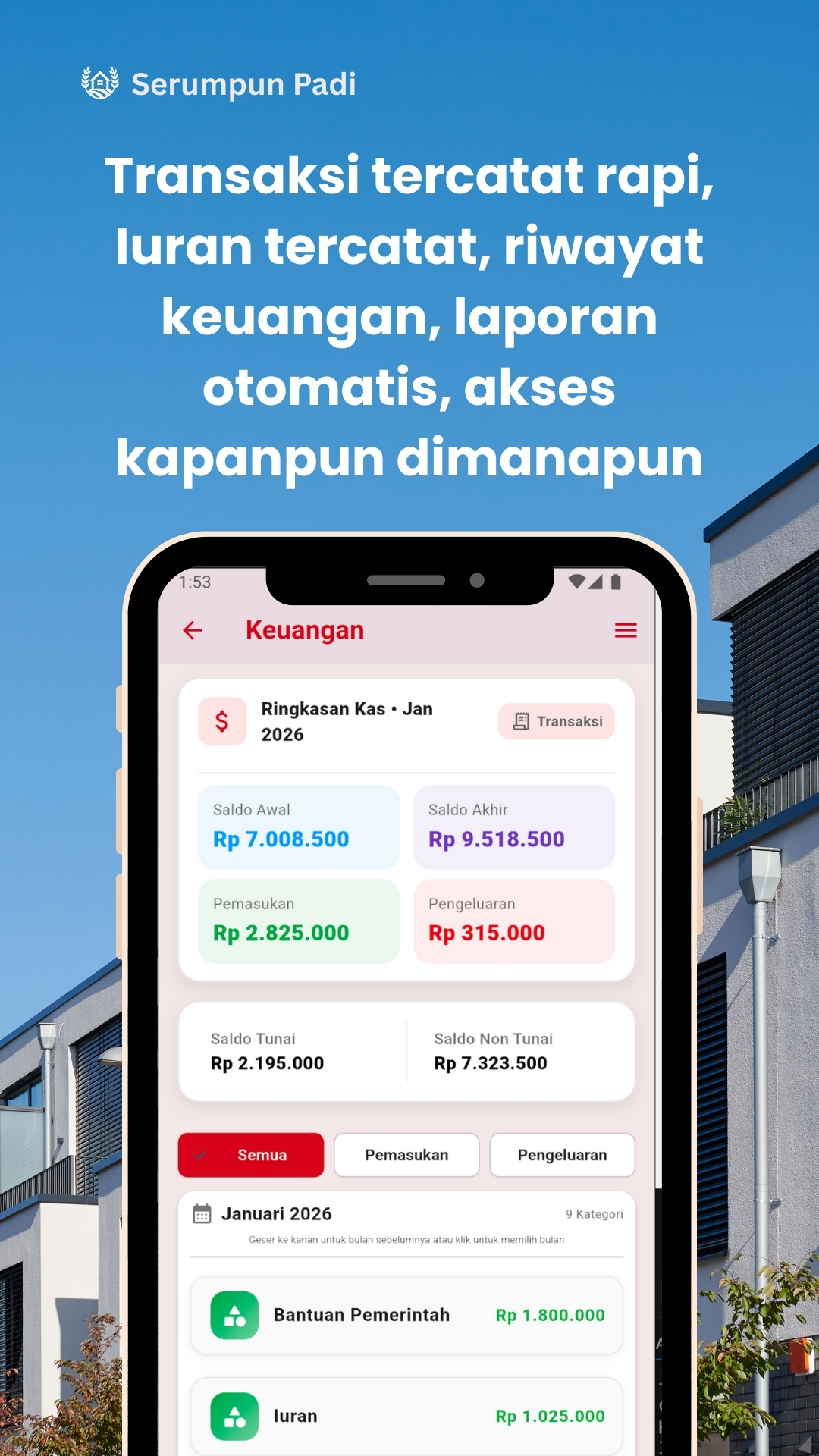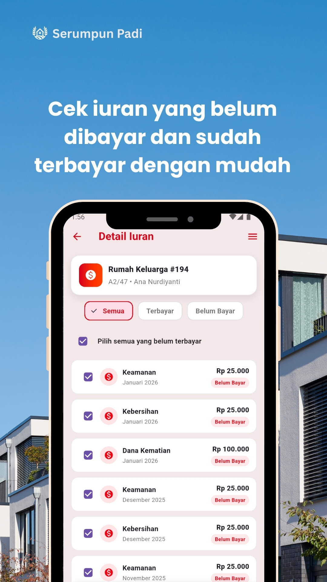 Dengan Serumpun Padi, proses administrasi lingkungan menjadi mudah & transparan. Warga bisa membayar iuran tanpa tatap muka, memantau histori pembayaran, serta menyampaikan aduan langsung melalui aplikasi.